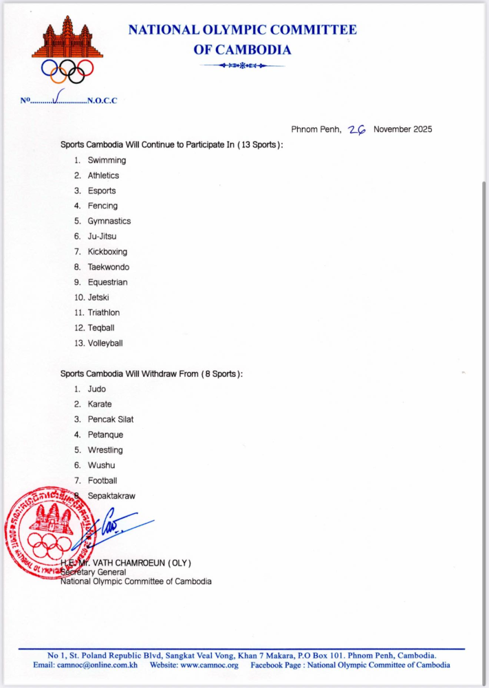 គណៈកម្មាធិការជាតិអូឡាំពិកកម្ពុជា (NOCC) និងក្រសួងអប់រំ យុវជន និងកីឡា បានប្រកាសជាផ្លូវការនៅថ្ងៃទី២៦ ខែវិច្ឆិកា ឆ្នាំ២០២៥ អំពីការសម្រេចចិត្តដ៏លំបាកមួយគឺ ដកខ្លួនចេញពីការប្រកួតចំនួន ៨ ប្រភេទកីឡា ក្នុងព្រឹត្តិការណ៍កីឡាស៊ីហ្គេម លើកទី៣៣ នៅប្រទេសថៃ (ពីថ្ងៃទី០៩-២០ ខែធ្នូ ឆ្នាំ២០២៥)។